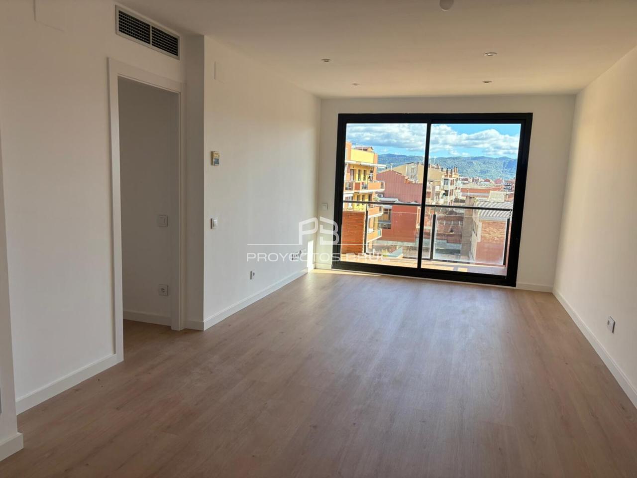Acabados cálidos con suelos de parquet, carpintería lisa blanca y exterior de aluminio.