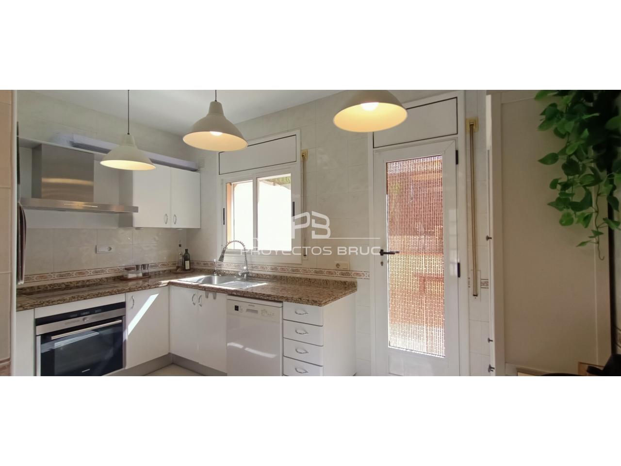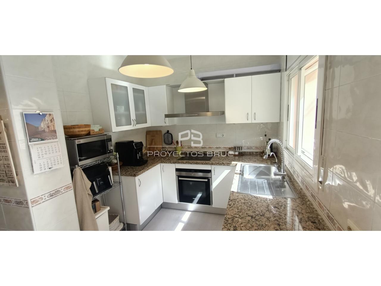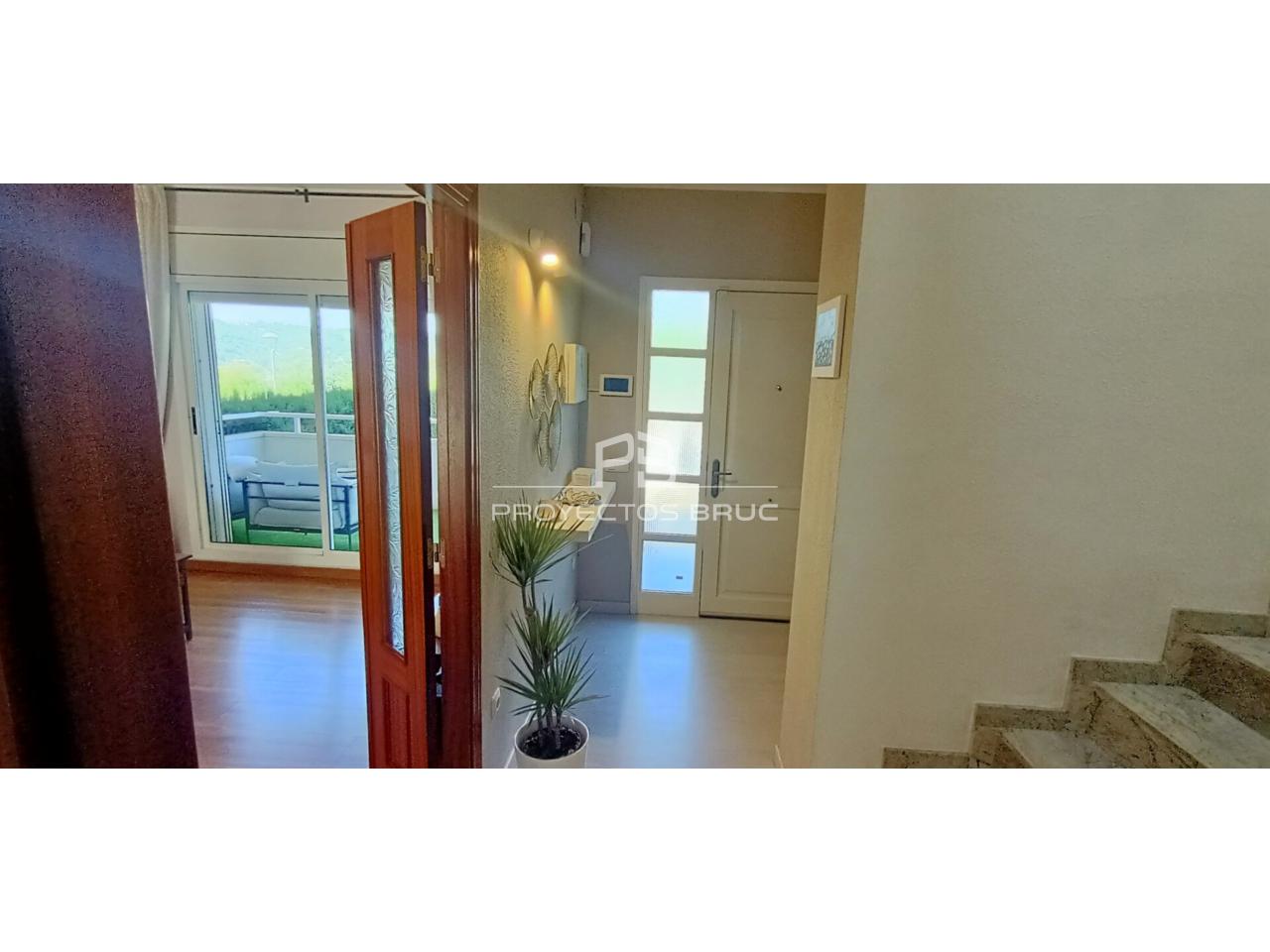 Entramos en la vivienda al recibidor dándonos paso al salón-comedor con terraza con vista a Montserrat, cocina independiente muy práctica con la salida al patio, acceso directo al garaje y aseo de cortesía.